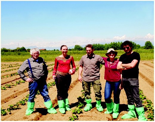 Het team in de Italiaanse kwekerijen met de Alpen op de achtergrond