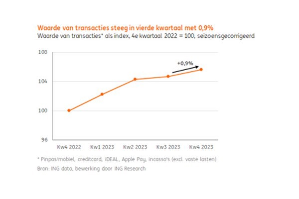 De consument lijkt duidelijk op de weg terug. Dat blijkt uit een analyse op basis van ING-transactiedata over het vierde kwartaal. De waarde van het totaal aantal transacties is ten opzichte van een kwartaal eerder toegenomen met 0,9%. Zowel in de winkelstraat als online is sprake van een toename van de transactieomzetten. De recente stijging ondersteunt de verwachting van ING Research dat de consumptie van huishoudens voor het eerst in vier kwartalen weer is toegenomen. In 2024 zal de consumptie naar onze verwachting verder aantrekken.
