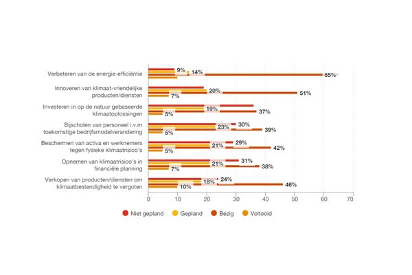 De overgrote meerderheid van de CEO’s hebben wereldwijd acties in gang gezet om efficiënter om te gaan met energie. Dat blijkt uit niue onderzoek van PwC. Wereldwijd is bijvoorbeeld slechts een derde van de 4.702 respondenten van de CEO Survey bezig met het implementeren van maatregelen die gericht zijn op de bescherming van werknemers, gebouwen en machines tegen de gevolgen van klimaatverandering. Ook investeren in maatregelen die de biodiversiteit moeten beschermen of herstellen, lijken een blinde vlek.