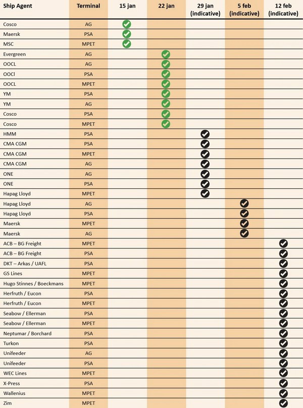 "Op 22 januari voegen we extra import-volume toe aan het CPu systeem. Onderstaande tabel geeft aan welke terminal / agent combinaties live gaan in de komende weken. Niet vermelde bedrijven en terminals achter de sluizen volgen later."