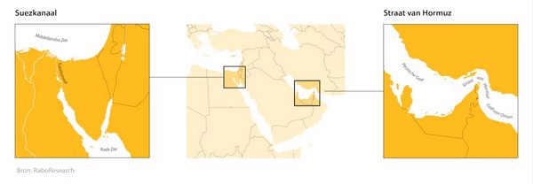 Bron: RaboResearch: Figuur 3: Knelpunten in verschepingsroutes: het Suezkanaal en de Straat van Hormuz