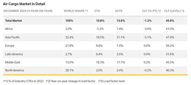 De wereldwijde vraag voor het volledige jaar in 2023, gemeten in vrachttonkilometers (CTK's), daalde met 1,9% ten opzichte van 2022 (-2,2% voor internationale operaties). Vergeleken met 2019 was er een daling van 3,6% (-3,8 voor internationale operaties).