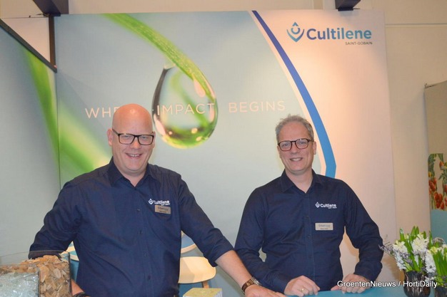 Mario Smid en Remy Maat van Cultilène. Cultilène heeft duurzaamheid hoog in het vaandel staan. Het substraat van glaswolsubstraat neemt toe. Zij maken daarvoor voor 80% gebruik van gerecycled glas.