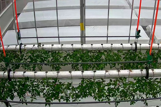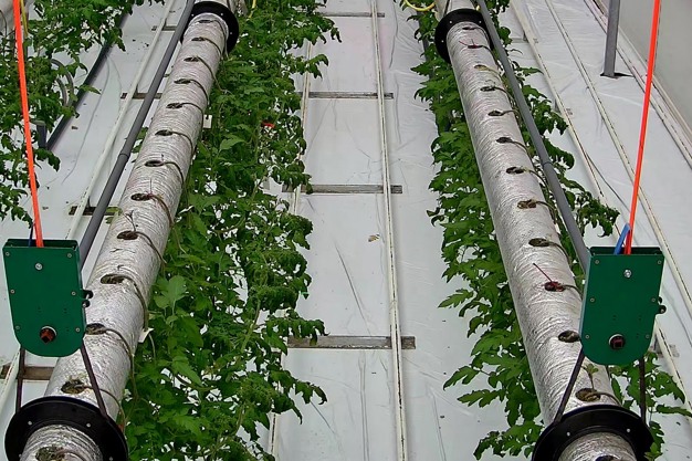 Enkele veranderingen zijn doorgevoerd. Zo is dit jaar het ras Merlice gekozen, nadat een ToBRFV-resistent ras vorig jaar dusdanig snel groeide dat dat voor het specifieke systeem niet ideaal bleek. Ook zijn teeltbuizen dit jaar anders gepositioneerd, 90 graden gedraaid en daarmee nu in de lengte geplaatst in plaats van dwars in de kas zoals bij de proef in 2023. In totaal gaat het om 8 buizen, goed voor 80 vierkante meter teeltoppervlak.