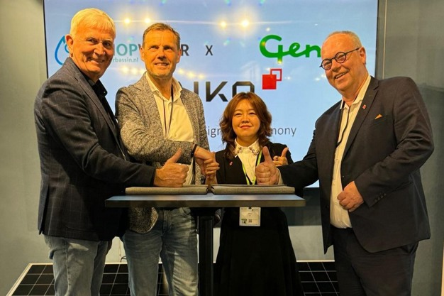 Tholen - Met een nieuw zonnepaneel met speciale eigenschappen kunnen telers dit jaar nog meer uit hun zonnepaneleninstallatie op een waterbassin halen. Dinsdag is op de HortiContact hiervoor een samenwerking officieel bekrachtigd. Aiko sluit als leverancier van speciale zonnepanelen aan bij Zon op Waterbassin, waarin Aquasol Solar en Genap al samenwerken.