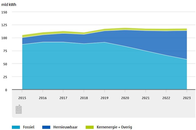De productie van elektriciteit uit wat bij het CBS 'hernieuwbare bronnen' heet, steeg in 2023 naar 57 miljard kWh. De elektriciteitsproductie uit windenergie nam vergeleken met het jaar daarvoor met 35 procent toe naar 29 miljard kWh. Deze groei komt mede door een toename van het opgestelde vermogen van windmolens, zowel op land als op zee. De totale capaciteit van windmolens kwam in 2023 uit op 11 GW.