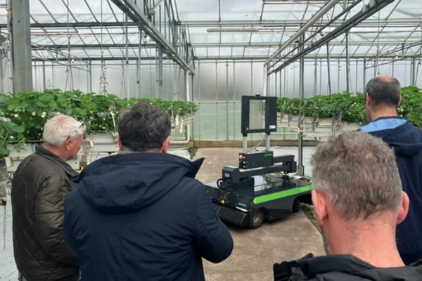 Het Belgisch-Nederlands bedrijf Octiva brengt een UV-C-robot op grote schaal op de markt die zonder buisrailsysteem autonoom door de kas kan rijden. Tijdens een demo in Achtmaal kon een aantal telers deze nieuwste Lumion-telg aan het werk zien.