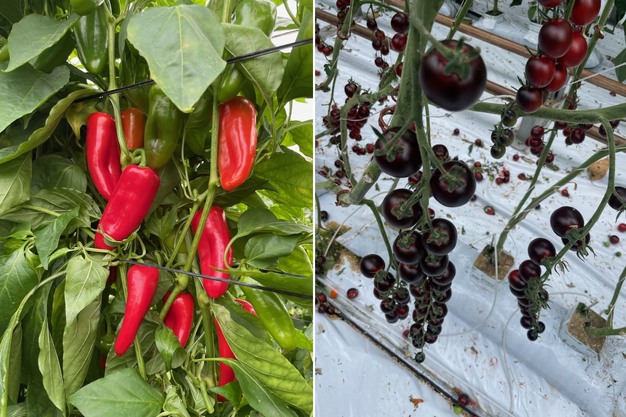 Links: snackpaprika's. Rechts: Mavros, een zwarte cherrytomaat.