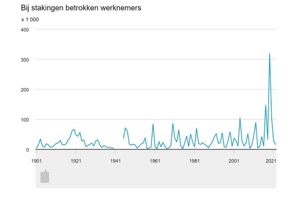 In 2019 waren 319 duizend werknemers betrokken bij stakingen, het hoogste aantal sinds het begin van deze statistiek in 1901. Ook in verhouding tot de werkzame beroepsbevolking was 2019 het recordjaar. Het aantal verloren arbeidsdagen door stakingen was in datzelfde jaar daarentegen niet uitzonderlijk hoog. Dit meldt het CBS. In het kader van zijn 125-jarig bestaan besteedt het CBS dit jaar extra aandacht aan historische ontwikkelingen.
