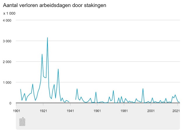 Verder terug in de tijd waren er jaren met nog veel meer verloren arbeidsdagen, ondanks dat er toen veel minder werknemers waren. Kennelijk duurden stakingen toen langer. Dit geldt vooral voor de jaren twintig. Het hoogtepunt lag in 1924, toen maar liefst 3,2 miljoen arbeidsdagen verloren gingen door stakingen. Er waren 27,1 duizend werknemers bij deze stakingen betrokken, ongeveer 1 procent van de werkzame beroepsbevolking.