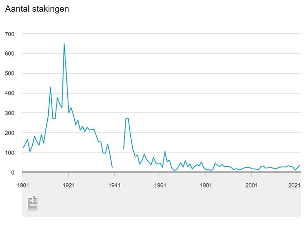 Ook het aantal stakingen was niet bijzonder hoog in 2019. Dat jaar waren er 26 verschillende stakingen. Het aantal stakingen was in de jaren twintig van de vorige eeuw veel hoger dan in het recente verleden. Het recordjaar was 1919 met 649 verschillende stakingen. Arbeiders staakten veel in de hoop tot betere cao-afspraken en de invoering van de 8-urige werkdag. Ook kort na de Tweede Wereldoorlog waren er relatief veel stakingen.