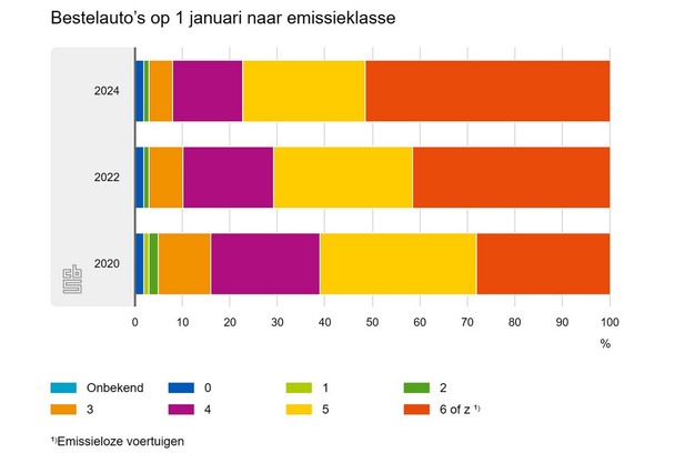 Op 1 januari 2024 stonden er in Nederland bijna 228 duizend bestelauto's geregistreerd met een emissieklasse van 4 of lager. Dit blijkt uit onderzoek van het CBS. Dit is bijna een kwart (23 procent) van alle bestelauto's. Deze voertuigen mogen vanaf 1 januari 2025 niet in de zero-emissiezone (ZE-zone) komen. Meerdere gemeenten voeren op die datum een dergelijke zone in.