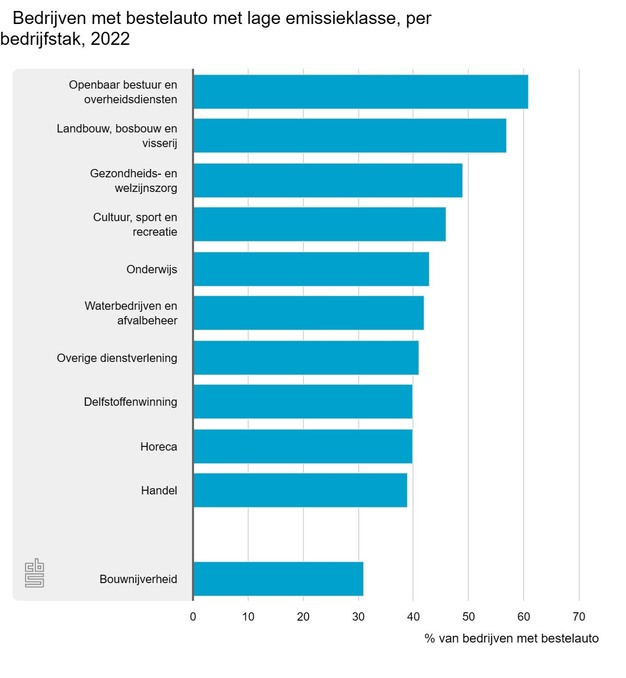Van de bedrijven of overheden met een bestelauto in het openbaar bestuur (zoals gemeenten of de politie) en landbouw, bosbouw en visserij, had rond de 6 op de 10 een of meer bestelauto's met een lagere emissieklasse in 2022. Bedrijven in het openbaar bestuur hebben vergeleken met bedrijven in andere sectoren een relatief groot bestelautopark. De bestelauto's met een lage emissieklasse actief in deze bedrijfstak maken met 9 procent maar een klein deel uit van het totaal aantal in deze bedrijfstak. Daarnaast worden relatief minder kilometers met deze voertuigen gereden dan in andere sectoren.
