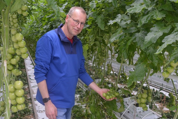 Ralf Albers inspecteert zijn tomaten kort voor de oogst. Ook zijn beide broers Thomas en Heinz-Jürgen runnen een tuinbouwbedrijf en zijn lid van de Gartenbauzentrale Papenburg.