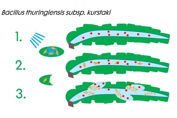 3. Eenmaal binnen de rups vallen de kristallen uiteen in individuele Cry eiwitten onder invloed van de hoge pH in de darmen van de rups. In oplossing binden de Cry eiwitten aan verschillende receptoren aan de darmwand van de rups. Dit zorgt voor gaten in het maag- darmkanaal, waardoor de rups sterft.