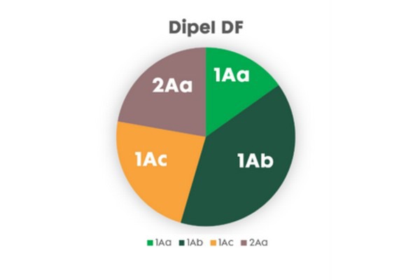De gelijke verdeling van de eiwitten is volgens Nufarm uniek. Het kleinste aandeel (1Aa) is nog steeds 15%, daarop volgen 2Aa, 1Ac en 1Ab met respectievelijk 22%, 23% en 39%. Hierdoor wordt een breed scala aan rupssoorten effectief bestreden.