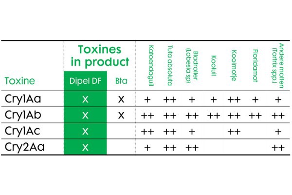 Hieronder een overzicht van de verschillende Cry eiwitten die Bacillus thuringiensis kurstaki produceert. In DiPel DF zijn vier verschillende Cry eiwitten aanwezig.