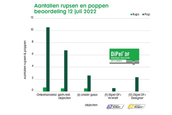 "Door het brede toxineprofiel bestrijdt DiPel DF veel verschillende rupsen én is het niet gevoelig voor resistentie. Zorg bij toepassing met DiPel DF dat het gewas goed wordt bedekt. Gebruik daarbij voldoende water. Alle geraakte delen zijn beschermd. Een uitvloeier zoals Hi-Wett verbetert de bedekking.Onder vochtige omstandigheden, met veel regen of condens, is het verstandig om in plaats van een uitvloeier, een hechter te gebruiken. Bijvoorbeeld Designer. Omdat de hergroei niet beschermd is, is ons advies om elke zeven dagen de DiPel DF behandeling te herhalen. Dit geeft het beste resultaat. Proeven en praktijktoepassingen met DiPel DF zorgen voor steeds meer kennis en ervaring. Een DiPel DF proef in sluitkool in 2022 laat bijvoorbeeld ook de krachtige werking op koolmot zien. Een belangrijke tip: Start op tijd bij het openbreken van de rupseneitjes. En herhaal tot de druk weg is."