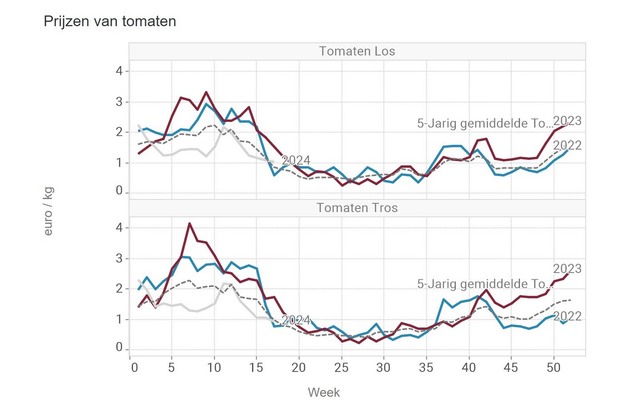 De tomatenprijzen liggen ruim onder de niveaus van 2023 en gelijk aan de prijzen in week 18 van 2022.