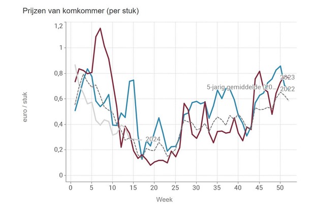 De gemiddelde stuksprijs voor komkommer bij de veilingen van het Verbond van Belgische Tuinbouwcoöperaties (VBT) lag op 41,6 eurocent in week 18.