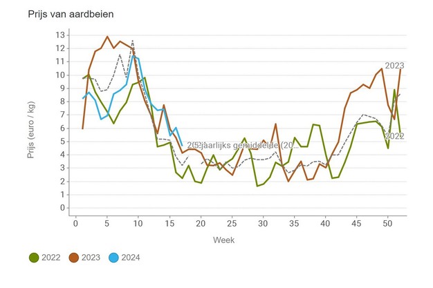 De middenprijs voor aardbeien komt in week 18 over de hele linie met diverse rassen uit op 4,22 euro per kilo. Elsanta noteert 4,23 euro en Sonsation afgerond 4,62 euro per kilo. Prijzen die net boven het vijfjarig gemiddelde liggen. De producties in de aardbeien liggen na een donkere periode nog wat achter.