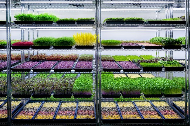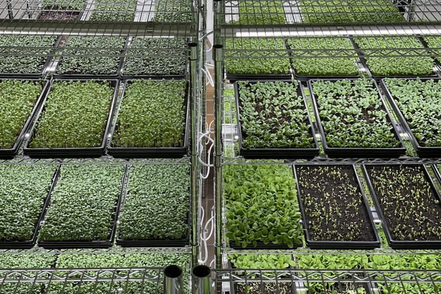 De microgreens worden verticaal geteeld op vijf niveaus en tot twee meter hoog.