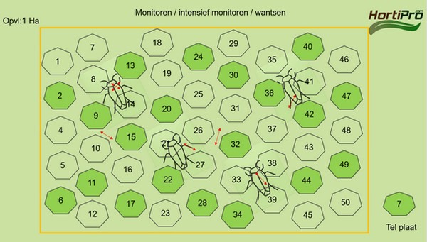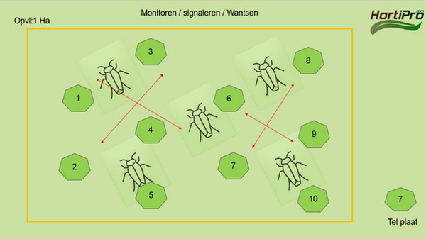 Het mooie met PheroNesi is volgens Lennart dat de teler er makkelijk mee kan opschalen, zodra dat nodig is. "Dan gaat het over het opschalen van de inzet voor signalering, met 10 feromonen per hectare, naar inzet voor monitoring, waarbij wij adviseren 20 stuks egaal per hectare te verdelen." Nog meer feromonen ophangen kan. "Dan spreken wij over intensief monitoren en gaat het over soms wel 50 tot meer dan 100 vangplaten met een PheroNesi-feromoon per hectare. In het buitenland komt dat zeker voor."