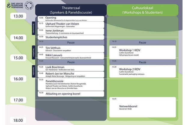 Onder leiding van dagvoorzitter Lucy van Keulen zal de dag in de theaterzaal worden ingevuld met diverse sprekers die interactieve lezingen aanbieden met betrekking tot de bovenstaande onderwerpen. Als afsluiting op de lezingen zal er in de theaterzaal een paneldiscussie plaatsvinden waar dieper in wordt gedoken op de eerder besproken onderwerpen en wetgeving. Gasten vanuit verschillende schakels van de verpakkingsketen schuiven aan om te reageren op uitdagende stellingen. Het gedetailleerde programma is in onderstaande afbeelding weergegeven.