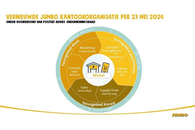 In de gewijzigde opzet van de organisatie is elk directielid verantwoordelijk voor een focusgebied. Daarbij treden twee nieuwe directeuren toe tot het directieteam: Wibo van Wijk is benoemd als inkoopdirecteur vanwege de toegenomen strategische focus op inkoop na de toetreding van Jumbo tot de internationale inkooporganisaties Everest en Epic Partners. Daarnaast benoemt Jumbo Jurrie van Rooijen tot IT directeur. Jurrie is nieuw binnen de Jumbo organisatie en heeft een uitgebreide ervaring in diverse IT management- en directierollen, waaronder 13 jaar als CTO bij bol.com.