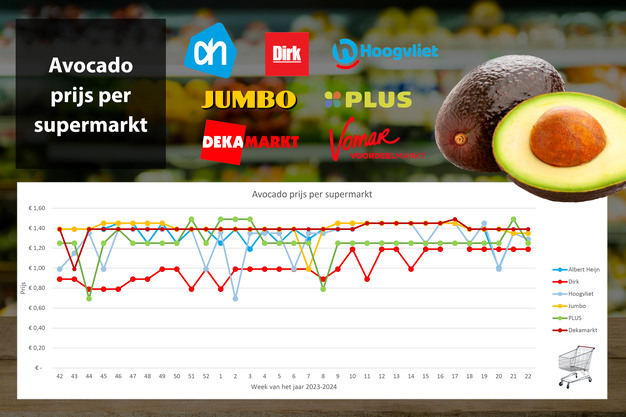 Prijsdata zijn afkomstig van Supermarktscanner.nl en gebaseerd op de online prijzen in de webwinkels van Albert Heijn, Jumbo, Plus, DekaMarkt, Dirk en Hoogvliet. De prijs is een gemiddelde, inclusief de promoties. In deze prijsvergelijking zijn herkomst en kwaliteit niet meegenomen. De meeste supermarkten vermelden deze gegevens niet op hun website, Hoogvliet en Jumbo vermelden het land van herkomst. Mogelijk worden in de bovenstaande prijsvergelijking onrijpe avocado's met rijpe vergeleken en Spaanse komkommers met Hollandse.
