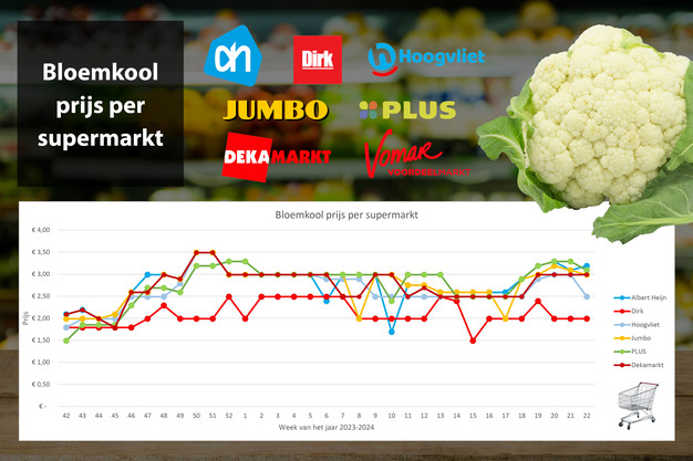 Marktleider Albert Heijn maakt een tegengestelde beweging met de bloemkoolprijs. In week 22 verhoogt AH de prijs met 10 eurocent, terwijl Jumbo met 10 cent, Plus met 20 cent en Hoogvliet zelfs met 50 cent de bloemkoolprijs verlagen. Dirk houdt het prijsverschil met 1,99 euro per stuk groot met de andere supermarkten, die hanteren een prijs tussen de 3 euro en 3,10 euro hanteren.