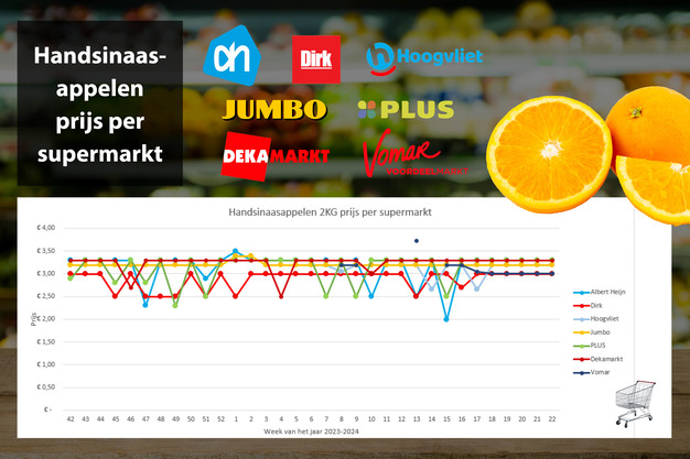 In de prijzen voor netjes handsinaasappelen passen we vanaf nu een conversie toe door deze om te rekenen naar prijs per kilogram. Hierdoor tonen we voortaan ook de prijzen bij Hoogvliet en Vomar. Omgerekend kosten sinaasappels bij deze supermarkten respectievelijk 3,19 euro en 3 euro per 2 kg.
