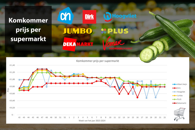 Het lijkt komkommertijd in de komkommers, geen prijsnieuws op dat gebied deze week: alle supermarkten behouden de vaste prijs in week 22. De vaste komkommerprijzen van de fullservice supers AH, Jumbo en Plus blijft op op 0,85 cent per komkommer, bij de andere supermarkten inclusief Vomar kost een komkommer 0,79 cent. Opmerkelijk is wel dat komkommer bij Dirk in week 22 uit het online assortiment is.