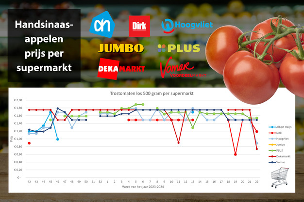 Gezien de gaten in de grafiek blijken losse trostomaten, niet altijd beschikbaar in het online assortiment van supermarkten. Jumbo biedt losse trostomaten al helemaal niet aan. Opmerkelijk is dat Jumbo wel de biovariant trostomaten per kilogram aanbiedt: 500 gram biotrostomaten kosten dan 2.69 euro per kilo.