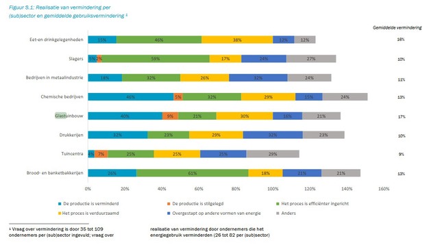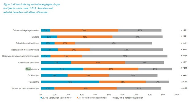 De onderzoekers zien dat in de glastuinbouw er in vergelijking met andere sectoren het energiegebruik meer is teruggeschroefd. 31% van de bedrijven in de glastuinbouw verbruikt veel minder energie, 40% verbruikt iets minder. Ook tuincentra en de chemische industrie hebben in vergelijking met andere sectoren hun verbruik relatief sterker verminderd. Als verklaring geven de onderzoekers aan dat in de glastuinbouw het doorberekenen van kosten niet eenvoudig is, waardoor terugschroeven van de productie eerder aan de orde is.