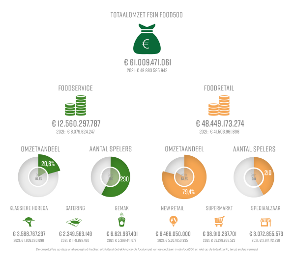 De bedrijven in deze FSIN Food500 2024 realiseren gezamenlijk een omzet van €61.009.471.061 op basis van de omzetcijfers over 2023. Dat is 22,3% meer dan in de 'corona-editie' van 2022. De omzetgroei met bijna een kwart is te danken aan het sterke herstel van de foodservicebedrijven en aan de forse inflatie in de afgelopen twee jaar.