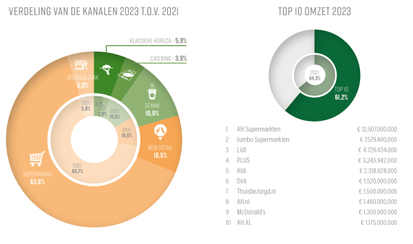 De 210 foodretailers in deze FSIN Food500 groeiden van €41,5 miljard naar €48,4 miljard; een stijging van 'slechts' 16%. Een deel van het in coronatijd verloren gegane marktaandeel kwam terug in Foodservice dat van een historisch lage 16,8% in 2021 steeg naar 20,6% marktaandeel in 2023.