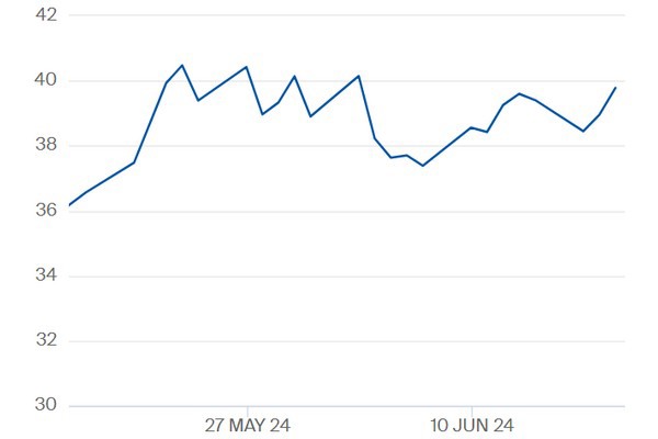 TTF-gasprijs kwartaal 1 2025 t/m 19 juni 2024. Klik hier voor de actuele prijzen op de Title Transfer Facility.