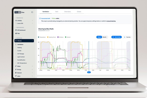 "Er fluctueert steeds meer in en om de kas. Denk alleen al aan energie, klimaat en verduurzaming. Alle veranderingen overstijgen steeds vaker het brein van de teler. Bovendien brengen steeds meer partijen met hun technieken extra intelligentie naar de teelt. Met Priva One integreren we oplossingen van partners, zoals Blue Radix, IUNU en Source.ag." Een vierde 'smaak' waaruit de teler momenteel kan kiezen is Priva's eigen Plantonomy-teeltstrategie, vult Martijn van Mechelen als Product Manager van Priva One aan.