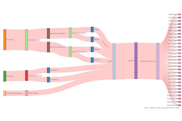 De Digital Twin, de kern van Priva ECO, is een virtuele kopie van de kas die alle installaties en energiebronnen in kaart brengt. Nienke Veenendaal somt een hele reeks op tijdens een uitleg aan de verzamelde vakpers op GreenTech Amsterdam. "De buizen zijn tot in detail nagemaakt, de ketel, belichting, de buffer, waarbij we ook rekening houden hoe snel die afkoelt en ook de weersomstandigheden voegen we toe." Het systeem registreert ook de gegevens van de energiecontracten die van toepassing zijn op de kas, inclusief de fluctuerende energieprijzen.