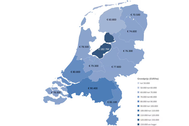 De gemiddelde agrarische grondprijs heeft in het vierde kwartaal van 2023 de grens van 80.000 euro per hectare (EUR/ha) doorbroken. De regionale verschillen in gemiddelde agrarische grondprijzen zijn groot. Deze variëren van 61.000 EUR/ha in Friesland tot 183.000 EUR/ha in Flevoland.