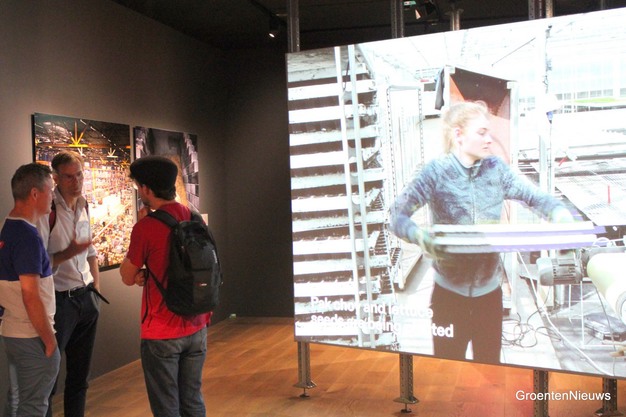Deelnemers in gesprek met Peter Groot Koerkamp naast bewegend beeld tijdens de expositie, hier bij Plantenkwekerij Gitzels. Dankzij de expositie in het Scheepvaartmuseum maakten al veel schoolklassen kennis met de internationaal opererende sector, en ook veel grote bedrijven kwamen met delegaties al een kijkje nemen, vertelde Kadir.