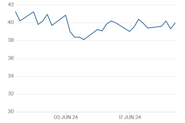 TTF-gasprijs kwartaal 1 2025 t/m 27 juni 2024. Klik hier voor de actuele prijzen op de Title Transfer Facility.