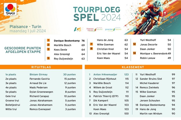 De laatste rit op Italiaanse bodem in deze Tour de France is maandag gewonnen door sprinter Biniam Girmay. Vijftien deelnemers aan het Takii Tourploegspel hebben de Afrikaanse sprinter in hun team en scoorden de volle punten. Met haar team met nog enkele sprinters scoorde Danique de meeste punten. Het levert haar een Takii-bidon op.