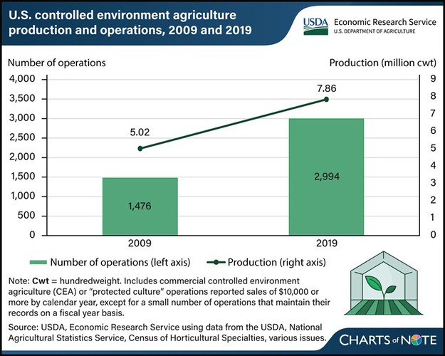 Van 2009 tot 2019 is in de Verenigde Staten de tuinbouw in een gecontroleerde omgeving (CEA), wat bestaat uit kassen, vertical farming, hydrocultuur, aquaponics en andere gecontroleerde teeltmethoden, met meer dan 100 procent gestegen. In 2009 waren er nog 1.476 bedrijven en in 2019 nog 2.994. De omvang van de productie steeg in dezelfde periode met 56 procent tot 7,86 miljoen ton.