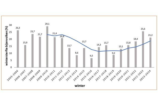 In de winter van 2023 - 2024 is 21,2% van de Nederlandse populatie van honingbijenvolken gestorven. Dit is minder sterfte ten opzichte van de voorgaande winter (Figuur 1), maar het is nog steeds een zorgwekkend hoog aantal bijenvolken dat deze winterperiode niet heeft overleefd. Het jaarlijkse wintersterftepercentage wordt vastgesteld door middel van een imker-enquête die ieder jaar wordt uitgevoerd door onderzoekers van Wageningen Universiteit & Research, in samenwerking met de Nederlandse Bijenhoudersvereniging (NBV), Imkers Nederland (IN), de biologisch-dynamisch werkende imkers (BD-imkers) en beroepsimkers (BVNI), in opdracht van het ministerie van LNV.