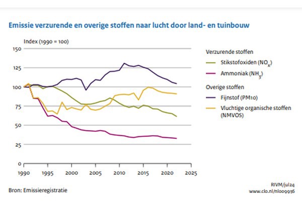 De uitstoot van NH3 is met ongeveer twee derde afgenomen. De afname komt door het toepassen van emissiearme mestaanwending, krimp van de veestapel, eiwitarm voer, afdekken van mestopslagen en emissiearme stallen.