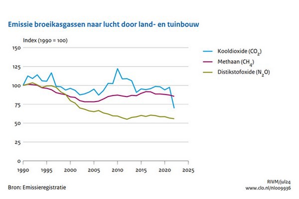 De uitstoot van CH4 daalde (-14%) door een afname van het aantal koeien en varkens en een hogere efficiëntie van koeien en varkens, waardoor ze minder voer verbruikten. De daling in 2022 ten opzichte van 2021 (-2%) komt volledig door een daling in het gasverbruik door de glastuinbouw. In 2022 waren de energieprijzen zeer hoog, waardoor de glastuinbouwsector 28% minder energie heeft verbruikt (Smit, 2023). De CO₂-uitstoot van de land- en tuinbouw daalde in 2022 veel sterker dan de CH4 uitstoot (-28%). Dit komt doordat de glastuinbouw de grootste bron van CO₂ is binnen de land- en tuinbouw, terwijl het maar een beperkt aandeel heeft in de uitstoot van CH4.