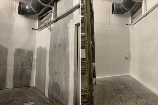 Daarom wordt Rubcoat niet alleen toegepast op de wanden en het plafond van een cel, maar ook op het vloerwandpaneel. "Een bewaarcel voor appelen en peren bestaat meestal uit sandwichpanelen en de silicone op de kitnaden laat mettertijd los of wordt poreus en is dus niet meer damp- en gasdicht. Dat lossen we op door de cel eerst met Rubcoat in te spuiten, het volledige oppervlak daarna met een vlies te bedekken, waarop tenslotte weer een laagje Rubcoat komt. Aangezien de coating flexibel is, wordt hij niet vlug beschadigd en is hij bestand tegen de lage temperaturen in de koelcellen, maar ook tegen de hoge temperaturen wanneer de cel gestoomd wordt."