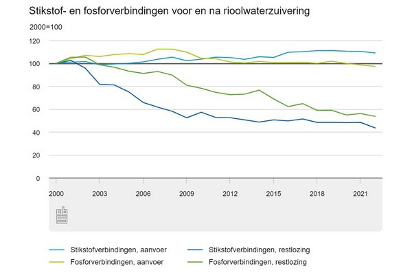 De restlozing van stikstof (13 miljoen kilogram) was in 2022 bijna 10 procent lager dan een jaar eerder. Van fosfor daalde de restlozing vanuit de rioolwaterzuiveringsinstallaties met ruim 4 procent naar 1,6 miljoen kilogram.